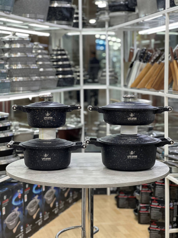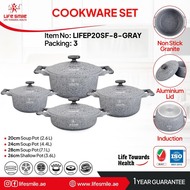 این تصویر یک سرویس قابلمه گرانیتی-تیتانیوم نچسب از برند Life Smile را نشان میدهد که برای آشپزخانههای مدرن طراحی شده است.