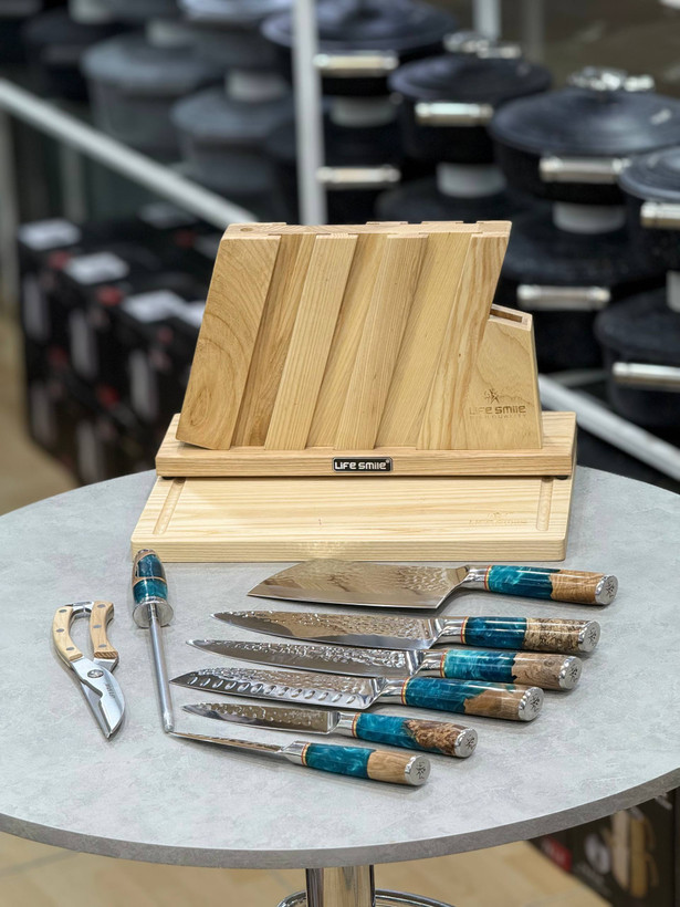 سرویس چاقو آشپزخانه لایف اسمایل مدل NSEL 20 محصول جدید برند LIFE SMILE است. این سرویس زیبا و کاربردی دارای 10 پارچه شامل ساطور، چاقوی سرآشپز، چاقوی سانتوکو، چاقوی برش، چاقوی پوست کندن، چاقوی عمومی، قیچی، ابزار تیز کننده، پایه نگهدارنده و تخته خردکن است. پایه نگهدارنده از جنس چوب ضد آب بوده که تمامی تعلقات را در خود جایی داده و فضای کمی را اشغال می کند و همچنین برای تخته خردکن نیز مکانی در پشت آن تعبیه شده است.
