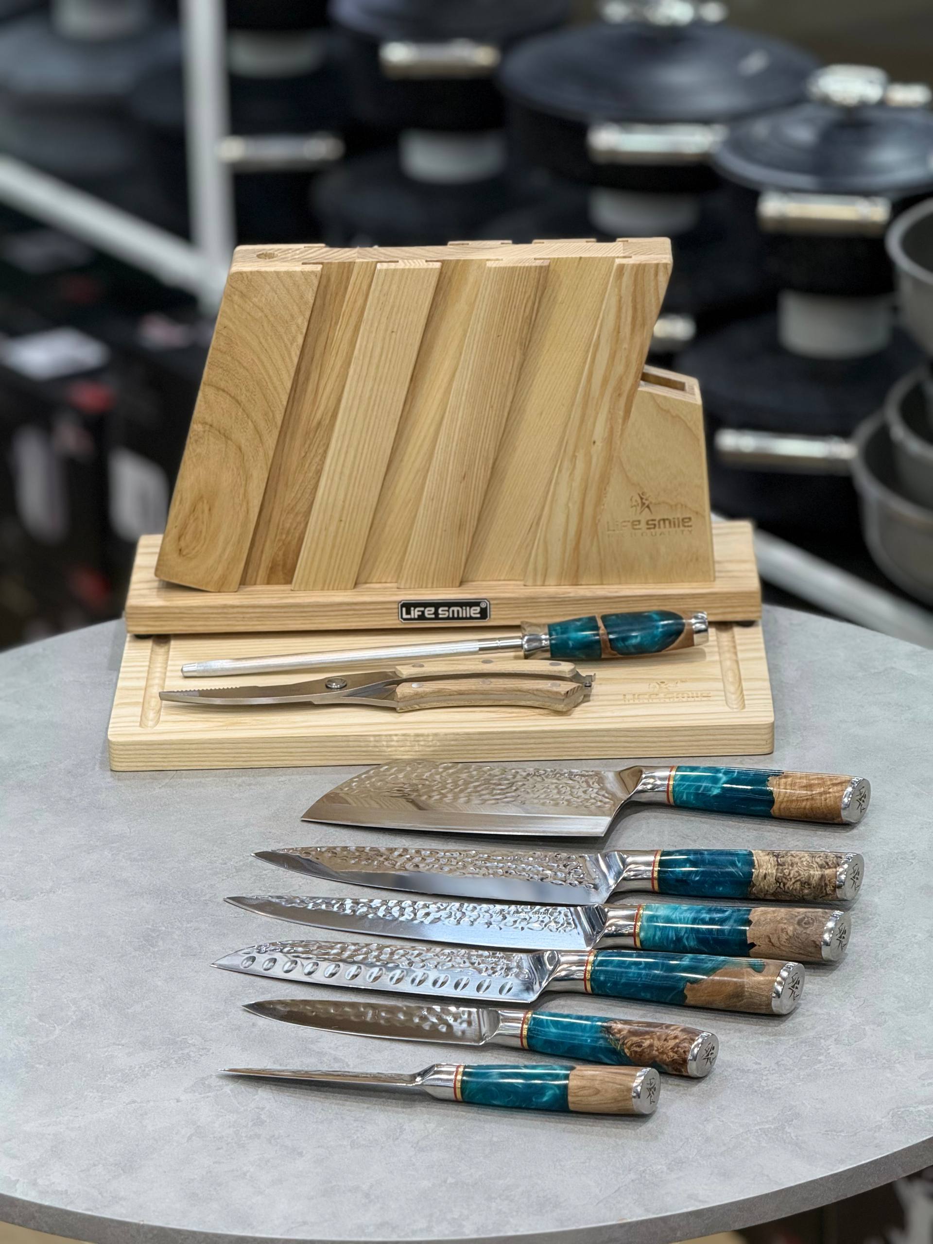 سرویس چاقو آشپزخانه لایف اسمایل مدل NSEL 20 محصول جدید برند LIFE SMILE است. این سرویس زیبا و کاربردی دارای 10 پارچه شامل ساطور، چاقوی سرآشپز، چاقوی سانتوکو، چاقوی برش، چاقوی پوست کندن، چاقوی عمومی، قیچی، ابزار تیز کننده، پایه نگهدارنده و تخته خردکن است. پایه نگهدارنده از جنس چوب ضد آب بوده که تمامی تعلقات را در خود جایی داده و فضای کمی را اشغال می کند و همچنین برای تخته خردکن نیز مکانی در پشت آن تعبیه شده است.