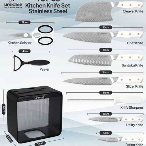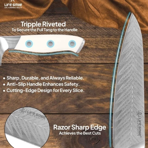 سرویس چاقوی لایف اسمایل مدل NSEL-19 | ترکیب زیبایی، کیفیت و عملکرد حرفهای در آشپزخانه سرویس چاقوی لایف اسمایل مدل NSEL-19 مجموعهای کامل و حرفهای برای آشپزخانههای خانگی و رستورانی است. این مجموعه شامل 10 ابزار کاربردی است: چاقوی ساطور، چاقوی سرآشپز، چاقوی سانتوکو، چاقوی برش، چاقوی همهکاره، چاقوی پوستکن، پوستکن مجزا، قیچی آشپزخانه، تیزکن و پایه چاقو. تیغهها از فولاد ضد زنگ با کربن بالا ساخته شدهاند که در کنار ساختار یکتکه با مهر دقیق، تیزی طولانیمدت و دوام بینظیری را ارائه میدهد. دستههای ارگونومیک این چاقوها طراحی شدهاند تا تعادل و راحتی را در هنگام برش و استفاده فراهم کنند. پایه چاقو با طراحی شیارهای دقیق، نگهداری ایمن و تراز چاقوها را تضمین کرده و جلوهای منظم و لوکس به آشپزخانه شما میبخشد. روکش برسخورده و رنگآمیزی زیبا نیز ظاهر مدرن و شیک این مجموعه را کامل میکند.