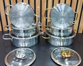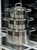 روکش داخلی این سرویس از جنس چدن است که علاوه بر زیبایی، مانع چسبیدن غذا به دیوارههای ظرف میشود. در هم با جنس استیل-شیشه ساخته شده است که تا حد امکان مشاهده وضعیت غذا در طی مراحل پخت را تسهیل میکند.